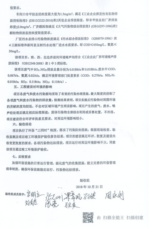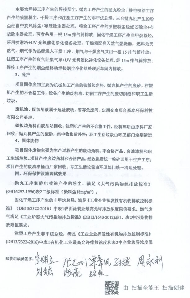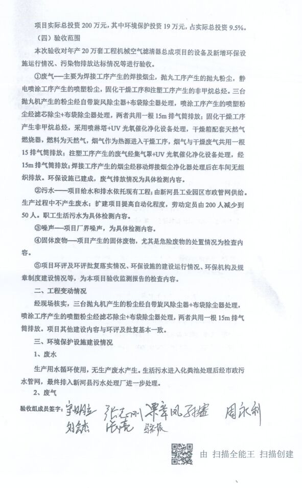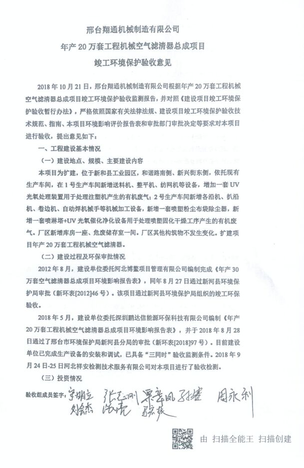邢臺翔通機械制造有限公司年產(chǎn)20萬套工程機械空氣濾清器總成項目竣工,環(huán)保保護驗收意見。
